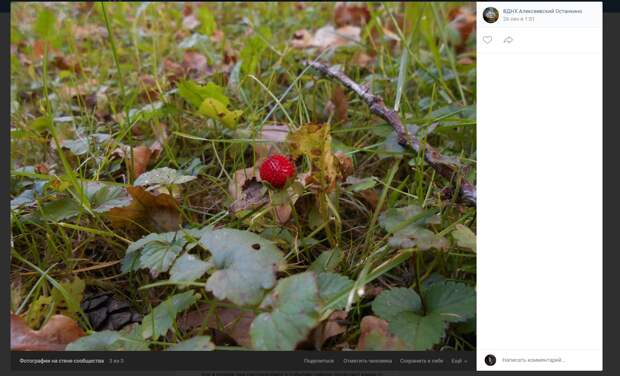 В Интернет-сообществе «ВДНХ Алексеевский Останкино» социальной сети «ВКонтакте» опубликовали фото Николая Морозова. Гуляя по Ботаническому саду, Николай заметил землянику, которая поспела осенью. Но, как отметили в комментариях, эта ягода является декоративной. Она называется дюшенея и плодоносит до самых заморозков.